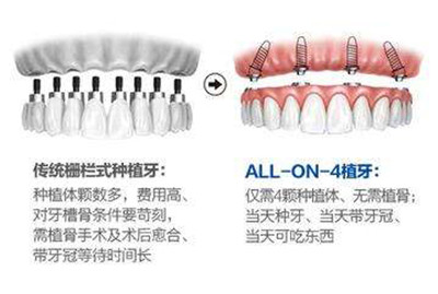 All-on-4®技术是目前国际全新种植术,主要针对于全口无牙或者半口无牙的情况,仅需4颗种植体,于两颗前牙部位的种植体垂直植入牙槽骨内,而两颗中远部位的种植体采取倾斜角度植入牙槽骨内,然后在种植体的基台上安装“拱形连桥”牙冠,完成口腔种植修复。它是一种即刻负重种植牙术,患者当天种植,当天戴冠,当天即可享受美食。但此项技术对种植医生的要求极高,因此目前在国内只有为数不多的医生能开展此项种植牙修复技术。